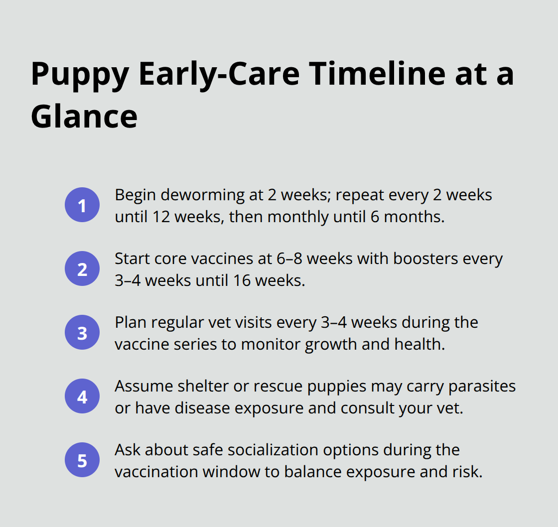 Key early-care milestones for puppies including deworming, vaccinations, and vet visit cadence. - puppy welfare concerns