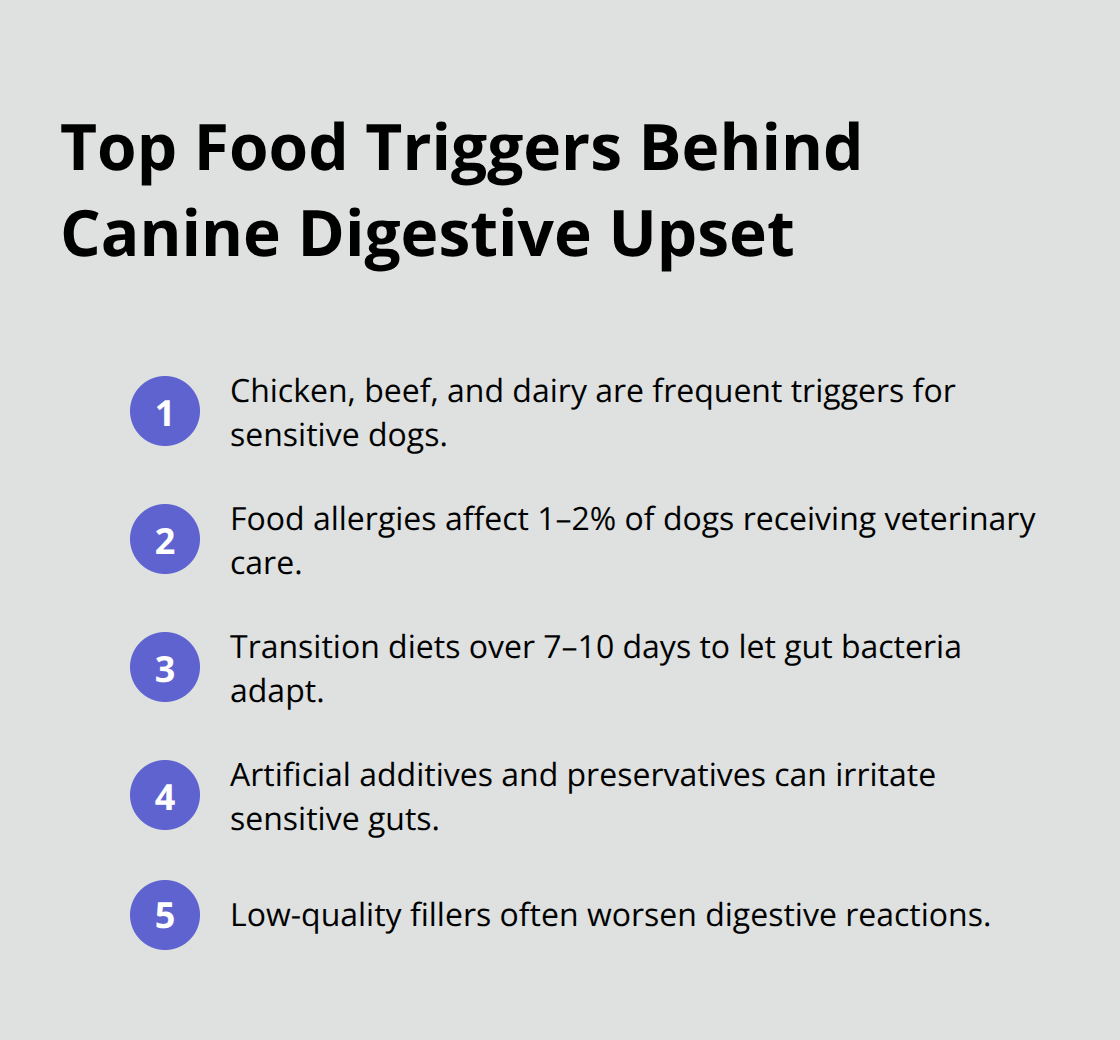 Food allergies affect 1–2% of dogs receiving veterinary care, with chicken, beef, and dairy products being common triggers for food-related digestive reactions. Sudden diet changes cause digestive upset in many dogs because their gut bacteria need 7-10 days to adapt to new proteins and carbohydrates. Artificial additives, preservatives, and low-quality fillers often irritate sensitive digestive systems more than natural ingredients do.