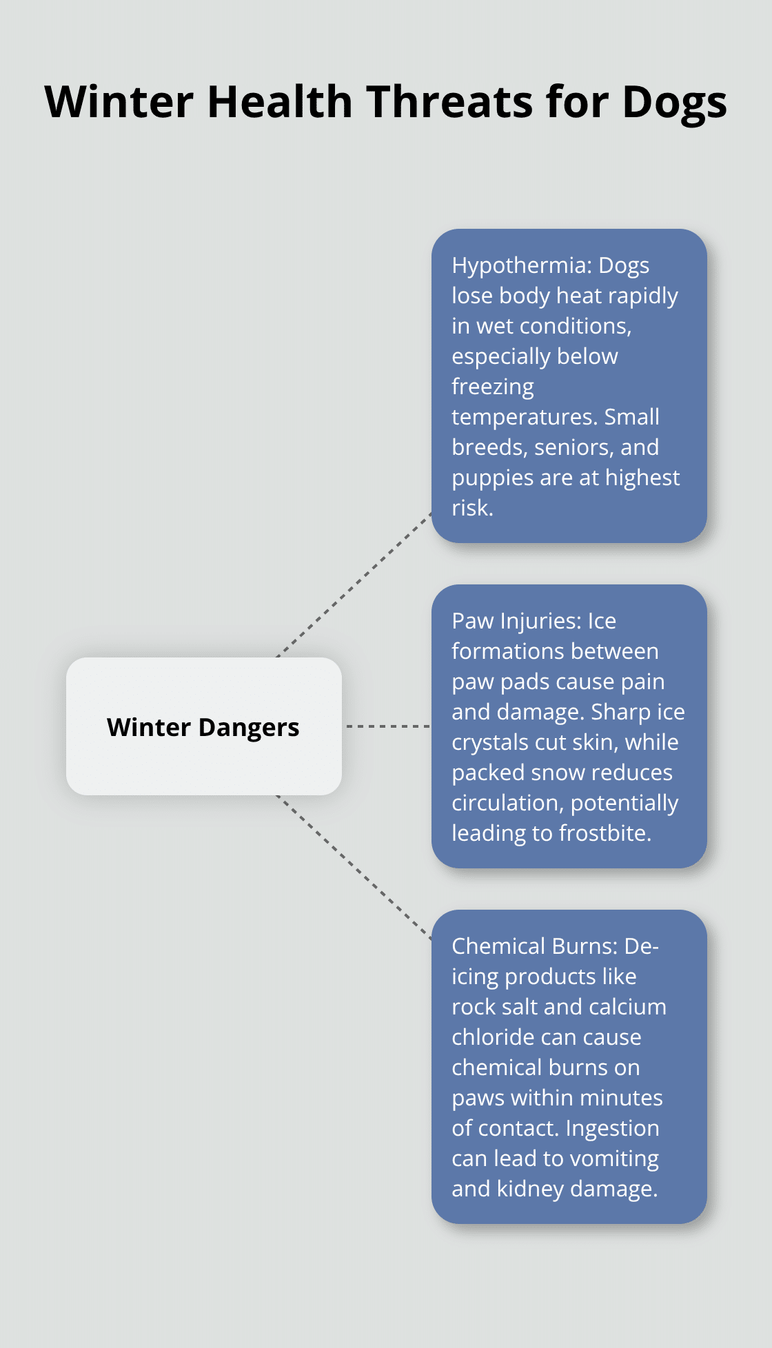 Cold weather creates three major health threats that turn routine walks into emergency situations. Dogs lose body heat rapidly in wet conditions, which makes hypothermia a real danger when temperatures drop below freezing. Small breeds, senior dogs, and puppies face the highest risk because their bodies struggle to maintain core temperature. Pets with diabetes, heart disease, kidney disease, or hormonal imbalances may have a harder time regulating their body temperature. Watch for early signs like excessive shivering, lethargy, and reluctance to move. Advanced hypothermia symptoms include muscle stiffness, shallow breathing, and loss of coordination.